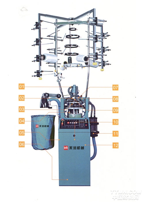 “禾潤(rùn)”牌HR50P7型絲襪機(jī)是由電腦控制的具有四路標(biāo)志系統(tǒng)的單針筒平紋絲襪機(jī)。該機(jī)采用獨(dú)立抽風(fēng)機(jī)或中央抽風(fēng)系統(tǒng)進(jìn)行織物牽拉,機(jī)器配備抗扭裝置。針筒轉(zhuǎn)動(dòng)采用伺服電機(jī)直接驅(qū)動(dòng)以減少轉(zhuǎn)動(dòng)鏈及傳動(dòng)誤差,由步進(jìn)馬達(dá)控制針筒升降,可產(chǎn)生不同疏密、加壓潤(rùn)滑油用以潤(rùn)滑針織、生克和選針片。電腦控制襪子的制作全過程、款式和品質(zhì)。該機(jī)可使用合成纖維、人造纖維以及裸氨綸和包覆紗等原料生產(chǎn)絲襪產(chǎn)品,包括連褲襪、九分褲襪等多種絲襪產(chǎn)品