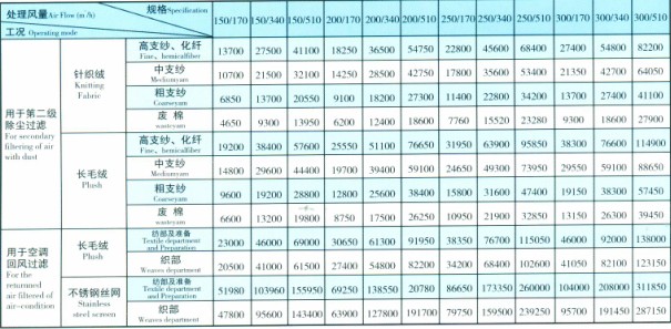 處理風量、濾料選用表
