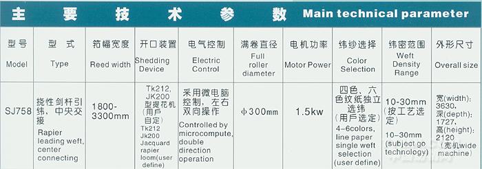 SJ758型提花劍桿織機(jī),SJ758型加寬提花劍桿織機(jī)主要適用于天然纖維(棉、毛、麻)、人造纖維、合成纖維、裝飾紗、雪尼紗等,交織成輕薄、中厚、厚重提花織物。