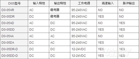 DL05系統(tǒng)PLC的I/O點數(shù)相同,為8如/6出,其外形尺寸也相同; 根據(jù)其I/O電氣特性的不同,目前可提供以下幾種型號的DL05PLC: