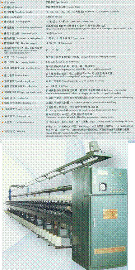 該機器技術(shù)先進、設(shè)計合理、外形美觀、采用人機界面,PLC變頻調(diào)速,光電檢測斷紗自停,數(shù)字定長裝置,技術(shù)先進的高速,高產(chǎn)量,高性能,低噪音的通用型高速松式絡(luò)筒。適用于純棉、純毛、多種化纖的筒紗及管紗卷繞成圓柱或圓錐形松軟筒子供高溫,高壓機染色的使用。