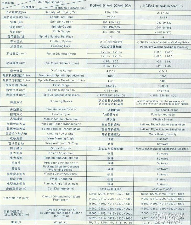 KGFA4101A/4102A/4103A四軸聯(lián)動電腦型高速懸錠粗紗機(jī),采用先進(jìn)的電腦數(shù)控技術(shù),去掉了老式粗紗機(jī)的錐輪機(jī)構(gòu)、機(jī)械成型機(jī)構(gòu)、快速升降機(jī)構(gòu)、差速機(jī)構(gòu),使四大傳動部分完全達(dá)到獨立傳動,由電腦數(shù)控及變頻驅(qū)動方式進(jìn)行四軸聯(lián)運(yùn),是目前國內(nèi)最先進(jìn)的機(jī)電一體化粗紗機(jī)設(shè)備,適用于普梳和精梳棉型纖維及人造纖維的純紡或混紡。