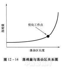 除塵刀與給棉羅拉和第一刺輥隔距點(diǎn)之間的距離,稱為第一落雜區(qū)長(zhǎng)度,落雜區(qū)長(zhǎng)度越大,排除的雜質(zhì)越多,但可紡纖維的損失也相應(yīng)增大。當(dāng)落雜區(qū)長(zhǎng)度在某個(gè)工作位置時(shí),落棉中雜質(zhì)和可紡纖維的比例處在一個(gè)最恰當(dāng)?shù)谋壤潆s區(qū)長(zhǎng)度越過這一優(yōu)化點(diǎn),落棉量可能急劇增大,可紡纖維的損失也可能隨之增加(見圖12-14)。