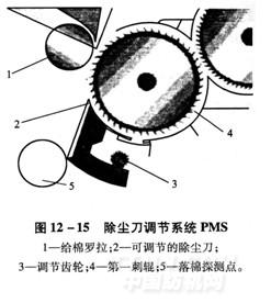 因此,除塵刀工藝調(diào)節(jié)要以落棉中雜質(zhì)與可紡纖維的比例為依據(jù)。TC03型梳棉機(jī)在吸風(fēng)罩窗前安裝有落棉感應(yīng)器TC-WCT,用于評(píng)估落棉質(zhì)量的測(cè)色傳感器,根據(jù)氣流和吸風(fēng)系統(tǒng)中的廢棉顆粒狀況,在落棉的某個(gè)集中點(diǎn)上進(jìn)行選擇性探測(cè),依據(jù)反射測(cè)量光束顏色的差異,辨別出落棉中的雜質(zhì)與可紡纖維的比例,優(yōu)化軟件根據(jù)輸送的信號(hào),可確定除塵刀的最優(yōu)化位置。除塵刀被鑲嵌在一個(gè)環(huán)繞第一刺輥圓周的圓弧導(dǎo)軌上,當(dāng)調(diào)節(jié)齒輪轉(zhuǎn)動(dòng)時(shí),就可使除塵刀沿圓弧導(dǎo)軌移動(dòng),進(jìn)而調(diào)節(jié)第一落雜區(qū)長(zhǎng)度。整個(gè)調(diào)節(jié)過程可在機(jī)器運(yùn)轉(zhuǎn)時(shí)進(jìn)行,通過電機(jī)驅(qū)動(dòng)調(diào)節(jié)齒輪,結(jié)合計(jì)算機(jī)屏幕顯示的雜質(zhì)與可紡纖維的比例只需幾秒種即可實(shí)現(xiàn)調(diào)節(jié)過程,方便快捷。見圖12-15。