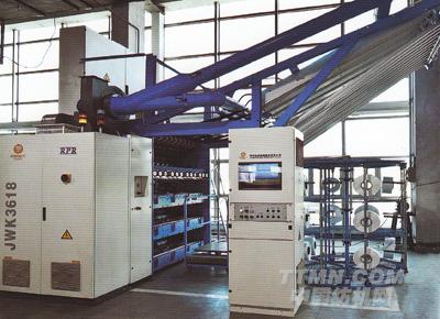 經(jīng)緯紡機(jī)股份有限公司榆次分公司最新推出與意大利RPR公司合作開(kāi)發(fā)成功的全自動(dòng)高速高效假捻變形機(jī)---JWK3618型假捻變形機(jī)。該機(jī)機(jī)械速度可達(dá)1500米/分,采用氣動(dòng)生頭,自動(dòng)落筒,導(dǎo)絲盤(pán)取代整體羅拉傳動(dòng)結(jié)構(gòu),導(dǎo)熱絲盤(pán)代替第二熱箱,實(shí)現(xiàn)了自動(dòng)化與高效率的完美結(jié)合。各項(xiàng)技術(shù)指標(biāo)均達(dá)到國(guó)際領(lǐng)先水平。
