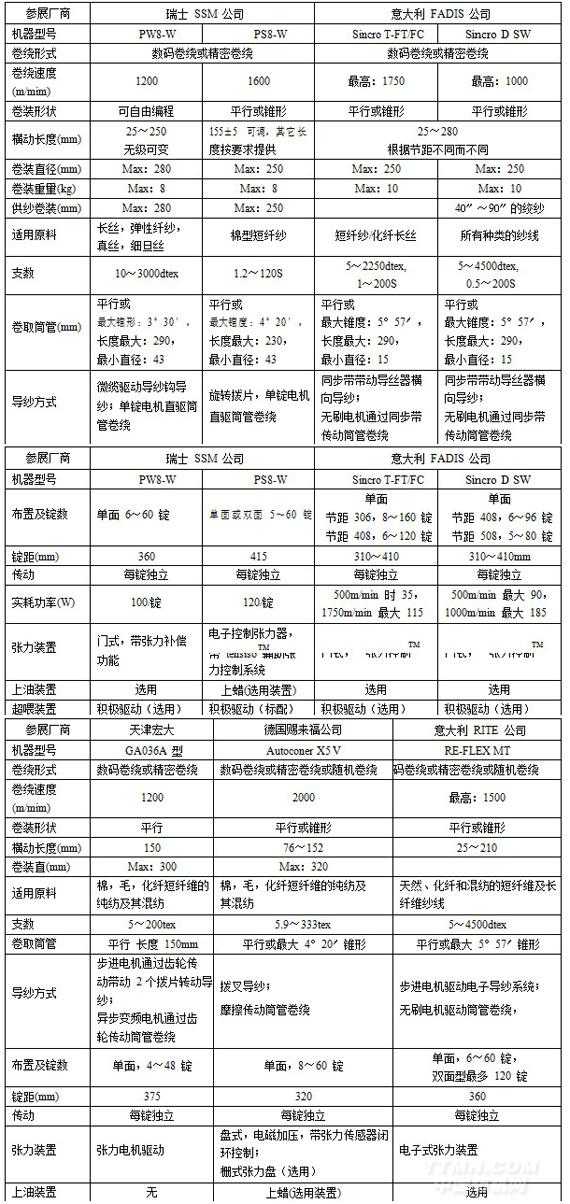 (1) 概述本屆展覽會(huì)有 9 家廠商展出自動(dòng)絡(luò)筒機(jī) 15 臺(tái),分別是:經(jīng)緯股份青島宏大紡織機(jī)械有限責(zé)任公司的 SMARO-I 細(xì)絡(luò)聯(lián)型自動(dòng)絡(luò)筒機(jī)、SMARO-E 托盤式自動(dòng)絡(luò)筒機(jī)、上海二紡機(jī)公司的 EJP438紗庫(kù)型自動(dòng)絡(luò)筒機(jī)、東飛馬佐里公司的 DTM439 紗庫(kù)型自動(dòng)絡(luò)筒機(jī)、江蘇凱宮機(jī)械股份有限公司的KGFA688 紗庫(kù)型自動(dòng)絡(luò)筒機(jī)、浙江泰坦股份有限公司的 TZL-2008 紗庫(kù)型自動(dòng)絡(luò)筒機(jī)、上海絡(luò)路機(jī)電科技有限公司的 MH-08G 紗庫(kù)型自動(dòng)絡(luò)筒機(jī),歐瑞康旗下賜來福(SCHLAFHORST)公司的AUTOCONER X5 V 細(xì)絡(luò)聯(lián)型自動(dòng)絡(luò)筒機(jī)、日本村田(MURATEC)公司的 PROCESS CONER IIQPRO VCF 型自動(dòng)絡(luò)筒機(jī)、PROCESS CONER II QPRO 托盤型自動(dòng)絡(luò)筒機(jī)、PROCESS CONER IIQPRO 細(xì)絡(luò)聯(lián)型自動(dòng)絡(luò)筒機(jī)(2 臺(tái))、意大利薩維奧(SAVIO)公司的 POLAR-I 細(xì)絡(luò)聯(lián)型自動(dòng)絡(luò)筒機(jī)、ORION SUPER M 紗庫(kù)型自動(dòng)絡(luò)筒機(jī)(濟(jì)寧生產(chǎn))和 POLAR MR 筒倒筒自動(dòng)絡(luò)筒機(jī)(1 錠)。