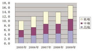 表1國(guó)內(nèi)市場(chǎng)不同檔次針布產(chǎn)品的銷(xiāo)售額(億元)