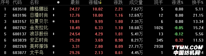 服裝家紡板塊走強(qiáng)。截至發(fā)稿,維格娜絲、振靜股份、日播時(shí)尚、拉夏貝爾漲停,天創(chuàng)時(shí)尚、萬(wàn)里馬、安奈兒、富安娜、羅萊生活等個(gè)股均有拉升表現(xiàn)。今日多數(shù)板塊題材資金均流入,服裝家紡板塊資金呈現(xiàn)凈流入狀態(tài)。