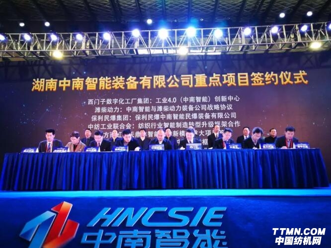 湖南華升集團有限公司控股子公司——湖南中南智能裝備有限公司(簡稱“中南智能”)正式掛牌,并與西門子、濰柴動力、保利民爆、中國紡織工業(yè)聯(lián)合會、天鼎豐、清華大學(xué)等8個智能制造產(chǎn)業(yè)項目順利簽約。