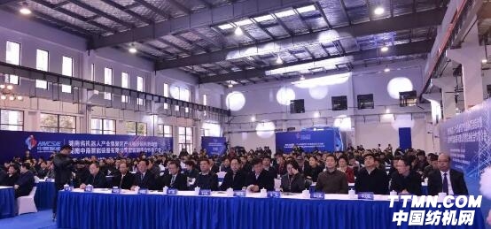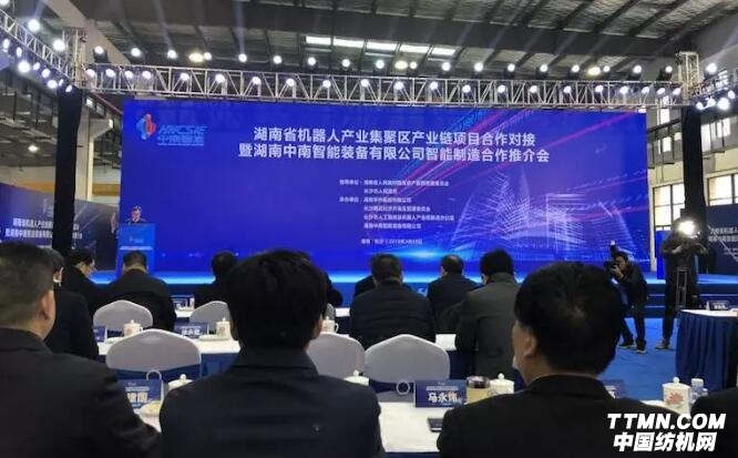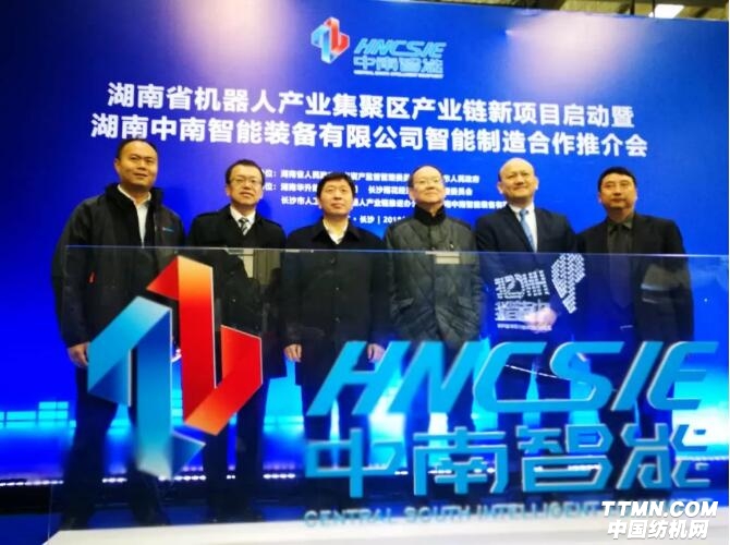 2018年3月20號,湖南省委常委、長沙市委書記胡衡華,中國紡織工業(yè)聯(lián)合會黨委書記高勇、副會長兼中國產(chǎn)業(yè)用紡織品行業(yè)協(xié)會會長李陵申,中國工程院院士俞建勇,中紡聯(lián)科技發(fā)展部主任彭燕麗,中國麻紡行業(yè)協(xié)會會長董春興等領(lǐng)導(dǎo)以及長沙市人民政府等地方領(lǐng)導(dǎo)和企業(yè)家代表三百余人共同參加“湖南省機器人產(chǎn)業(yè)集聚區(qū)產(chǎn)業(yè)鏈新項目啟動暨湖南中南智能裝備有限公司智能制造合作推介會”。