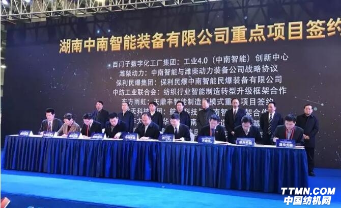 會上,各位領(lǐng)導(dǎo)為湖南中南智能裝備有限公司進(jìn)行了揭牌儀式,并見證了中南智能與中紡聯(lián)、天鼎豐等單位的合作項目簽約儀式。