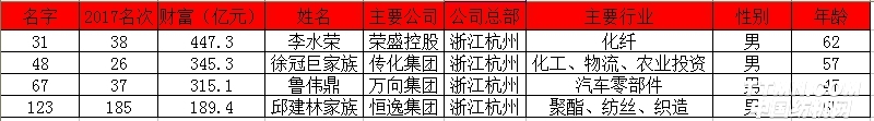 其中,蕭山4人進(jìn)入榜單。榮盛控股李水榮以447億排名全國第31位,傳化集團(tuán)徐冠巨家族以345億排名全國第48位,萬向集團(tuán)魯偉鼎以315億排名全國第67位,恒逸集團(tuán)邱建林家族以189億排名全國第123位。