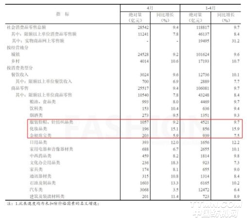 4月份,時尚類別銷售仍有不錯表現(xiàn),特別是化妝品市場持續(xù)強勁,當月銷售增幅15.1%至196億元,唯較首季16.1%有所放緩,并拖累1-4月增速降至15.9%;服裝市場增幅9.2%,同樣弱于首季度9.8%;金銀珠寶銷售錄得5.9%的增速,較首季7.9%有較大的放緩。