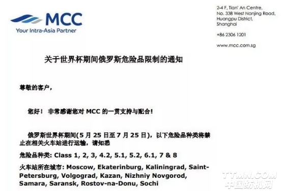 由于即將到來的2018俄羅斯世界杯,自2018年5月25日至2018年7月25日期間,俄羅斯采取加強安全的措施。2018年5月18日至2018年7月25日期間到達俄羅斯港口,危險品運輸將受到限制。船公司MCC已發(fā)出通知,請有運輸下列貨物的外貿(mào)、貨代人密切注意!