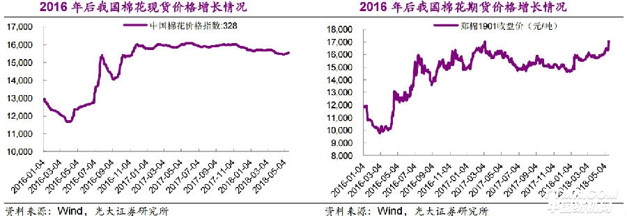光大證券指出,2018年以來鄭棉期貨價格持續(xù)上漲,5月鄭棉價格進一步走強,5月16日鄭棉1901品種收盤價17050元,當日上漲4.03%、較年初低點(14445元)上漲13.57%,且持倉和成交量顯著放大,期貨市場對棉花漲價預期逐漸升溫。
