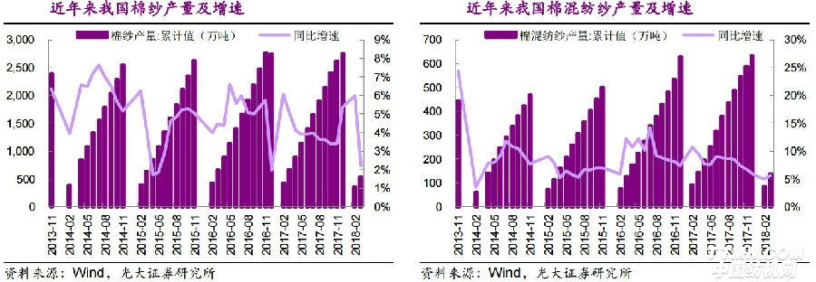 光大證券預計,2018年服裝消費回暖,拉動棉花需求,而國內(nèi)棉花種植面積和產(chǎn)量可能同比下降,2018年4月中國棉花協(xié)會調(diào)查結(jié)果預計2018年全國植棉面積為4217.5萬畝,同降4.43%。據(jù)《期貨日報》組織的新疆調(diào)研顯示,2018年新疆遭遇多次極端天氣,影響新棉生長,減產(chǎn)概率較高。棉花供需缺口持續(xù)存在,預計國儲棉庫存將進一步消化降至較低水平,制約內(nèi)棉價格上漲的庫存壓力減小。國儲棉價格通常低于新棉,8月底輪出將結(jié)束、新棉逐步上市,此外,部分國儲棉尤其是地產(chǎn)棉質(zhì)量相對較差、難以滿足下游生產(chǎn)需求,且國儲棉需要保持一定的安全儲備量,補庫存預期逐漸加強,棉紡企業(yè)對國儲棉需求有望提升,我們判斷年內(nèi)棉價上行概率加大。