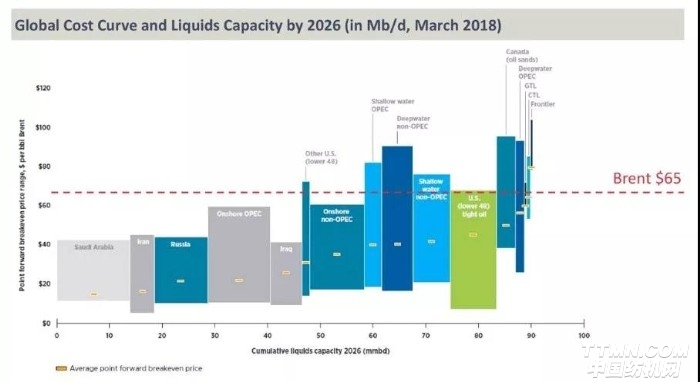 根據(jù)老牌能源研究機構(gòu)Wood Mackenzie報告,油價在65美元附近所有石油生產(chǎn)商都有的賺,其中沙特、伊朗、俄羅斯等產(chǎn)油大國的盈虧平衡價(breakeven price)最低,只要油價不跌破20美元,就不會虧本,當然也不會賺。