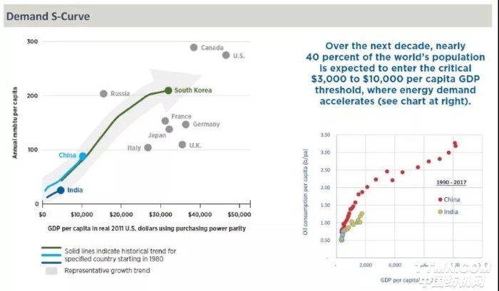 根據(jù)購買力平價測算,人均GDP越高的國家,石油需求量也越大,中國就是典型的例子,從1990年開始,隨著人均GDP上升,人均石油消費量也逐漸攀升?,F(xiàn)在的印度就像21世紀初的中國,GDP剛開始攀升,根據(jù)IMF預(yù)測,未來十年里,占世界人口約40%的印度,人均GDP將跨進3000-10000美元大關(guān),如果印度發(fā)展順利,那么石油需求量將再一次急劇攀升。
