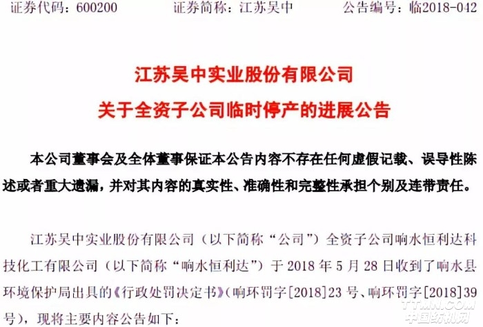 就在同一天,江蘇吳中發(fā)布公告稱,其全資子公司響水恒利達(dá)化工,收到環(huán)保局《行政處罰決定書》合計(jì)共罰91萬。