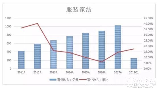根據2017年及2018年第一季度我國服裝家紡消費零售額來看,其增速相比2016年有明顯的改善趨勢,這也就說明終端需求回暖了。