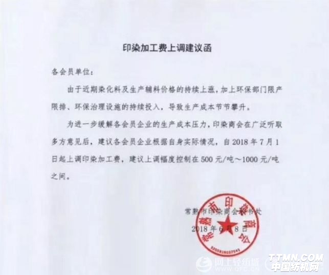 6月6日,一張《印染加工費(fèi)上調(diào)建議函》在朋友圈刷屏,該調(diào)價(jià)函來(lái)自常熟市印染商會(huì),不過(guò)日期竟然是6月8日,很多朋友朋友圈留言:有時(shí)差,可以認(rèn)真點(diǎn)嗎?