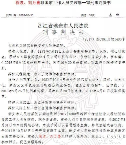 5月30日,中國裁判文書網(wǎng)發(fā)布程波、劉萬喜非國家工作人員受賄罪一審刑事判決書,二者系華峰氨綸工作人員。