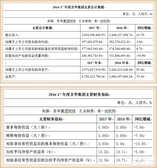 財(cái)報(bào)顯示,吉華集團(tuán)2017年實(shí)現(xiàn)營(yíng)業(yè)總收入24.56億元,同比增長(zhǎng)13.70%,實(shí)現(xiàn)歸屬于母公司股東的凈利潤(rùn)3.97億元,同比增長(zhǎng)3.96%。截止報(bào)告期末,吉華集團(tuán)資產(chǎn)總額47.81億元,比上年末增加59.36%;負(fù)債總額6.53億元,資產(chǎn)負(fù)債率為13.66%,比上年末減少了10.19個(gè)百分點(diǎn);歸屬于上市公司股東的股東權(quán)益總額為39.71億元,比上年末增加85.46%。