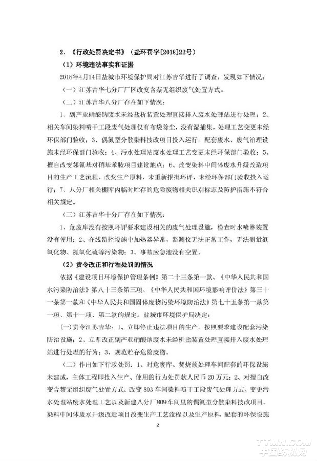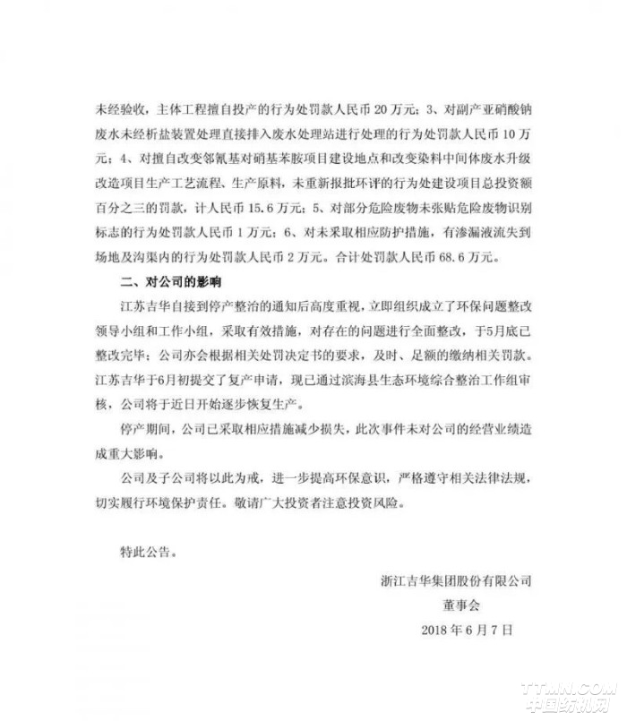 6月7日,吉華集團發(fā)布公告,其子公司江蘇吉華6月5日收到環(huán)保局的處罰決定書,共被罰款83.6萬元;并于6月初提交了復(fù)產(chǎn)申請,已通過濱海環(huán)保綜合整治工作組審核,將于近日逐步恢復(fù)生產(chǎn)。