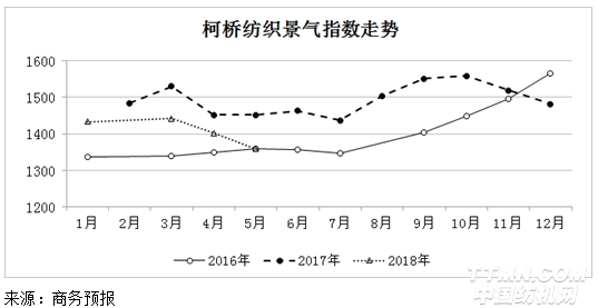 2018年5月份柯橋紡織景氣指數(shù)為1358.35點(diǎn),環(huán)比下降3.1%。其中,服裝面料類指數(shù)1667.33點(diǎn),環(huán)比下降4.7%;原料類指數(shù)1118.89點(diǎn),環(huán)比下降4.6%;坯布類指數(shù)1174.71點(diǎn),環(huán)比下降2.4%;家紡類指數(shù)1283.94點(diǎn),環(huán)比上漲3.1%;服飾輔料類指數(shù)2784.68點(diǎn),環(huán)比上漲0.2%。近期內(nèi)需持續(xù)偏弱,夏季產(chǎn)品銷量下降,秋季品種訂單不足,預(yù)計(jì)后期柯橋紡織景氣指數(shù)將繼續(xù)下行。
