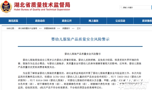 6月11日,湖北省質(zhì)監(jiān)局官網(wǎng)發(fā)布嬰幼兒服裝產(chǎn)品質(zhì)量安全風(fēng)險(xiǎn)警示(以下簡(jiǎn)稱(chēng)風(fēng)險(xiǎn)警示)。