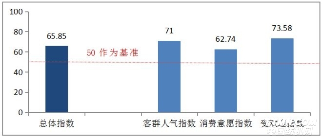 整體上看,中國購物中心的總體指數(shù)為65.85,高于50的基準(zhǔn)線,表明我國購物中心整體呈現(xiàn)良好的態(tài)勢,受到消費(fèi)者喜愛。其中購物中心受歡迎指數(shù)最高,其次是客群人次指數(shù)和消費(fèi)意愿指數(shù)。