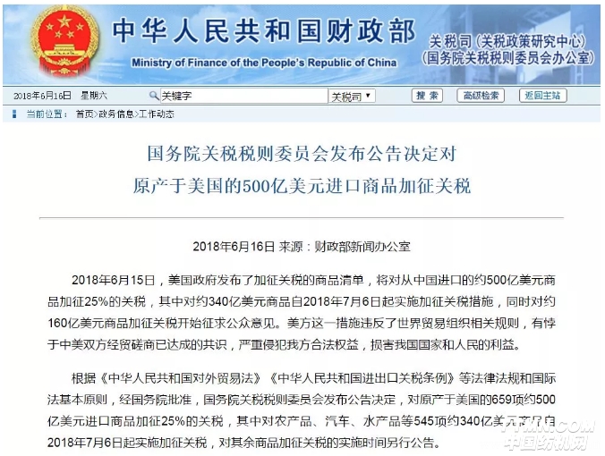 對此,財政部16日凌晨發(fā)布公告:國務院關稅稅則委員會決定對原產(chǎn)于美國的659項約500億美元進口商品加征25%的關稅,同時公布了加征關稅的商品清單。