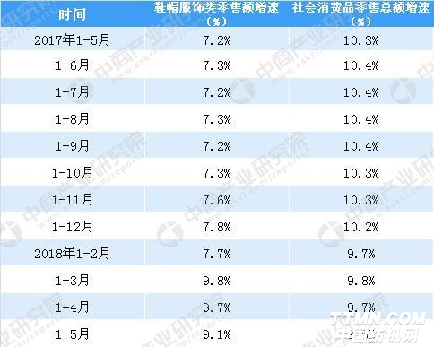 在飲料零售方面,2018年5月份服飾鞋帽類零售總額達1053億元,與去年同期增長6.6%。2018年1-5月全國服飾鞋帽類零售總額達5564億元,與去年同期增長9.1%。