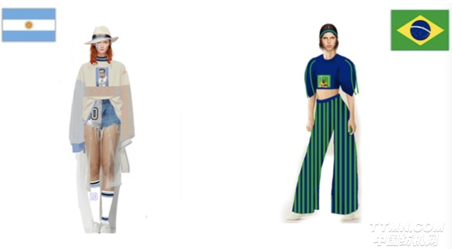 “這一系列以不同國(guó)家的國(guó)旗作為出發(fā)點(diǎn),在服裝配色上契合了國(guó)旗的配色,強(qiáng)對(duì)比高純度的顏色使得服裝的層次比較豐富,服裝的情緒也表達(dá)的更加張揚(yáng)??钍缴媳容^偏運(yùn)動(dòng)休閑的風(fēng)格,能看出設(shè)計(jì)師本身想要體現(xiàn)的足球文化和足球精神。”