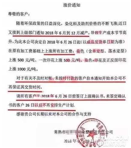6月19日,江蘇常熟一印染企業(yè)發(fā)出漲價通知:隨著環(huán)保政策的日益深化,染化料及助劑的不斷飛漲;近日又接到上級部門通知6月到12月減產(chǎn),導(dǎo)致生產(chǎn)成本節(jié)節(jié)高升,為此本公司決定自2018年6月26日起(以成品發(fā)貨單日期為準)在原有加工費基礎(chǔ)上上漲所有加工費。