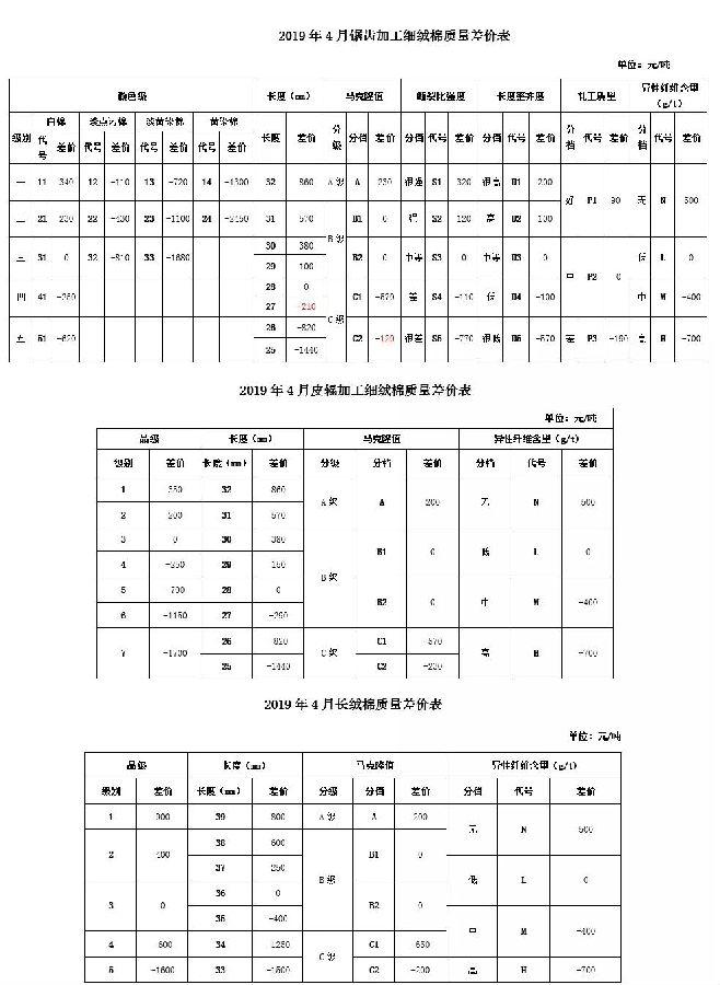 依據(jù)2019年4月的棉花公檢質(zhì)量數(shù)據(jù)、中國(guó)棉花協(xié)會(huì)棉花質(zhì)量?jī)r(jià)差自動(dòng)生成系統(tǒng)采集的棉花加工企業(yè)銷售成交價(jià)、紡織企業(yè)監(jiān)測(cè)點(diǎn)的采集數(shù)據(jù)以及當(dāng)月的中國(guó)棉花價(jià)格指數(shù),2019年5月鋸齒加工細(xì)絨棉質(zhì)量差價(jià)調(diào)整數(shù)據(jù)據(jù)此生成,并征求行業(yè)內(nèi)質(zhì)檢、貿(mào)易、紡織、期貨、地方協(xié)會(huì)等相關(guān)專家的意見(jiàn),現(xiàn)對(duì)《鋸齒加工細(xì)絨棉質(zhì)量差價(jià)表》做出如下調(diào)整(單位:元/噸):
