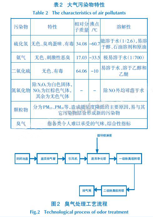 目前,國內外針對紡織印染廢水異味氣體特點,常采用的處理方法有物理凈化法、化學凈化法[7]、生物凈化法及綜合凈化法。項目根據(jù)大氣污染物特性(表1)設計臭氣處理工藝流程,采用凈化塔+一級除臭吸附塔+二級除臭吸附塔處理,詳見圖2。
