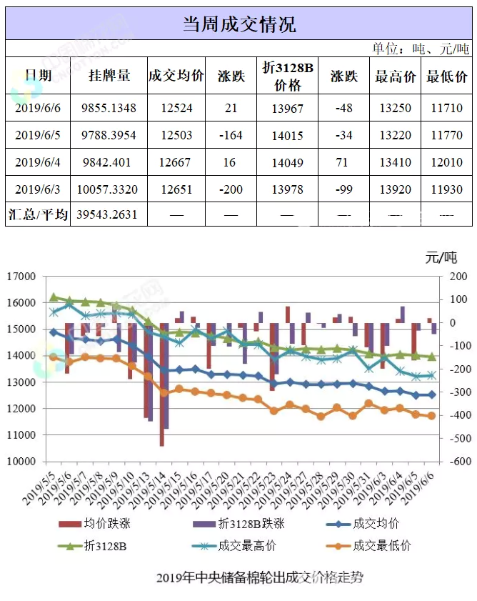 上周(2019年6月3-6日)是2019年中央儲備棉輪出第五周,中國儲備棉管理有限公司累計掛牌儲備棉3.95萬噸,其中新疆棉1.94萬噸,地產(chǎn)棉2.01萬噸。