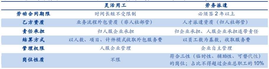 靈活用工主要是指以崗位外包形式為企業(yè)提供彈性用工的雇傭模式,以解決企業(yè)突增的、高峰期的、季節(jié)性的人員需求,實現(xiàn)因需而變,減少用人的風險和成本。采用靈活用工模式,可以幫助企業(yè)減少正式員工人數(shù),實現(xiàn)用工風險平均降低 50%,用工彈性提升30%的效果;而且可以為企業(yè)節(jié)省用工成本,因為企業(yè)只需支付員工任務期限內(nèi)的薪酬,并且是按實際工作的時長/天數(shù)付費。而且與勞務派遣相比,靈活用工具有勞動合同時間長短不受限制,雇員的管理責任由人力資源服務企業(yè)承擔,雇員崗位不受限制等優(yōu)勢,未來會逐漸得到企業(yè)管理者的青睞。