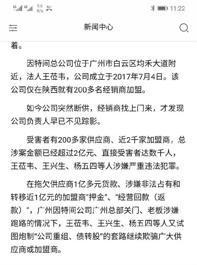 關(guān)于廣州因特間公司王蒞韋、王興生、楊五四等人涉嫌詐騙200多家供應商、近2千家加盟商重大違法犯罪的情況反映,具體如下: