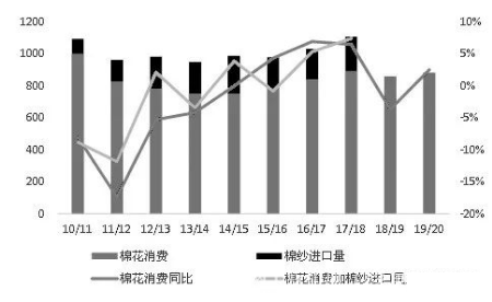 圖為中國棉花消費(fèi)量及棉紗進(jìn)口量(萬噸)