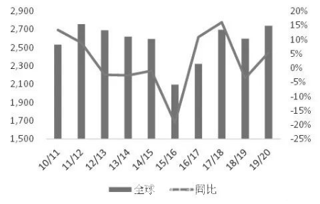 圖為全球棉花產(chǎn)量(單位:萬噸)及同比