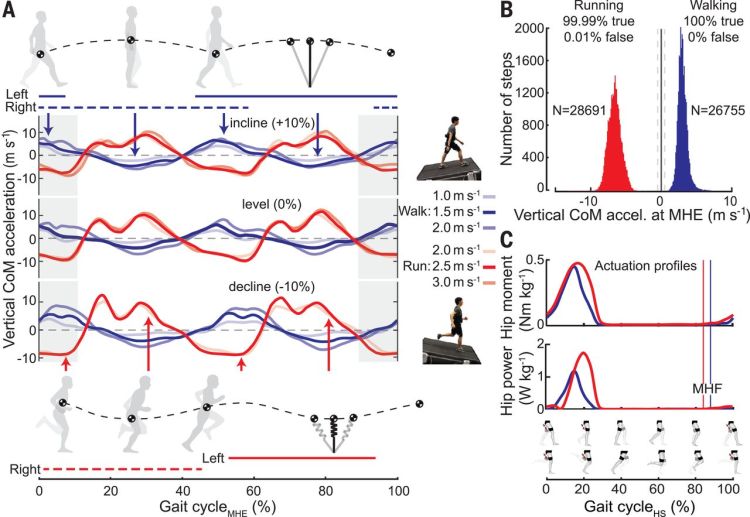 走路時(shí),人體的質(zhì)心移動(dòng)就像一個(gè)“倒立擺”(圖A上部),隨著兩只腳的前后移動(dòng)發(fā)生偏移。