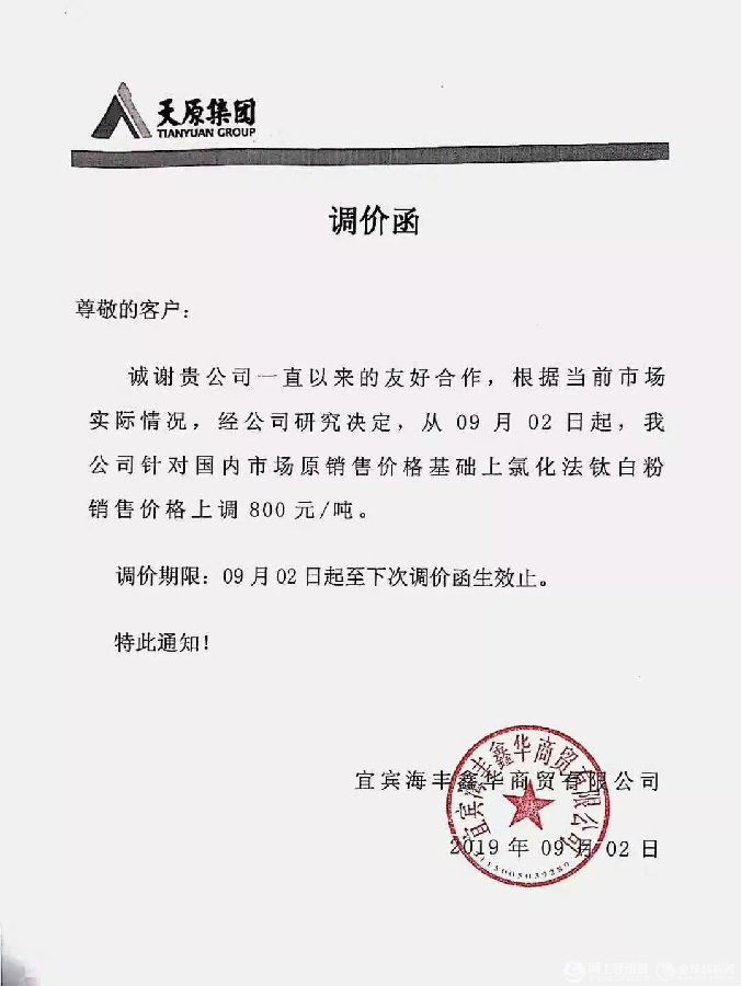 宜賓海豐鑫華商貿(mào)有限公司(以下簡稱“海豐鑫華”)發(fā)布調(diào)價函稱,根據(jù)當前市場實際情況,經(jīng)研究決定,自9月2日起,針對國內(nèi)市場原銷售價格基礎(chǔ)上氯化法鈦白粉銷售價格上調(diào)800元/噸。