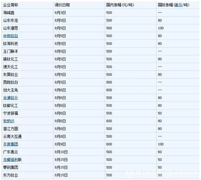 此前在8月8日,海豐鑫華就發(fā)布過調(diào)價函,稱自8月9日起,其在原銷售價格基礎(chǔ)上氯化法鈦白粉銷售價格上調(diào)600元/噸,國外市場上調(diào)100美元/噸。
