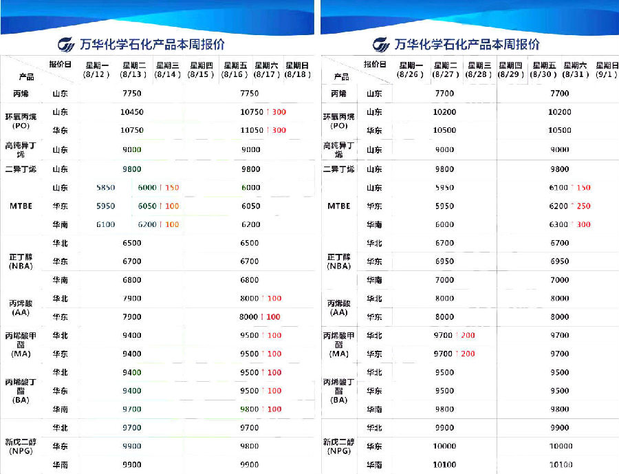 以國內(nèi)化工巨頭萬華化學(xué)為例,近1個月內(nèi),萬華MTBE報價上漲兩次,分別為:
