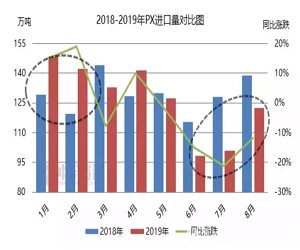 2019年是國(guó)內(nèi)PX瘋狂擴(kuò)能的元年,4季度主要關(guān)注浙江石化400萬(wàn)噸/年P(guān)X裝置的具體投產(chǎn)日期。若4季度海南煉化及浙江石化共計(jì)500萬(wàn)噸/年P(guān)X裝置正常運(yùn)行,則PX進(jìn)口量進(jìn)一步下降,按照兩套裝置70%-80%的開工負(fù)荷估算,國(guó)內(nèi)將增加29-33萬(wàn)噸/月PX產(chǎn)量。