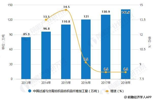 2013-2018年中國過濾與分離紡織品紡織品纖維加工量統(tǒng)計及增長情況
