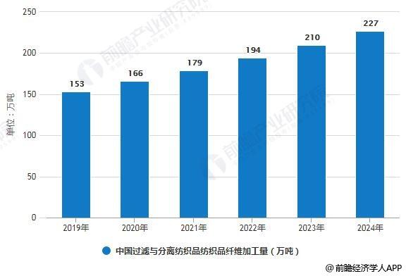 根據(jù)前瞻產(chǎn)業(yè)研究院預測,2019-2024年中國過濾與分離用紡織品纖維加工量將會繼續(xù)上升,預計在2024年達到227億元。