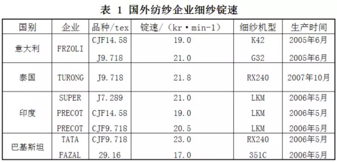環(huán)錠細紗機實現(xiàn)高速生產(chǎn)是棉紡企業(yè)長期以來孜孜以求的目標,圍繞提高細紗速度,行業(yè)協(xié)會、相關(guān)組織開展了各種形式的技術(shù)交流、探討,如2013年中國紗線網(wǎng)組織的“全國細紗高速大討論”,組織了紡機、紡器和紡紗企業(yè)技術(shù)、管理人員進行廣泛交流、討論,對棉紡企業(yè)進一步提高細紗速度起到了推動作用;然時至今日,我國絕大多數(shù)企業(yè)實際紡紗速度仍不高,與國外企業(yè)比仍有差距(見表1)。筆者認為,實現(xiàn)細紗高速,是一項系統(tǒng)工程,涉及企業(yè)技術(shù)管理方方面面,是企業(yè)綜合管理水平的體現(xiàn)。